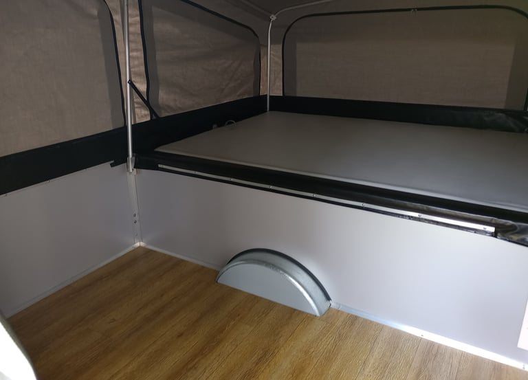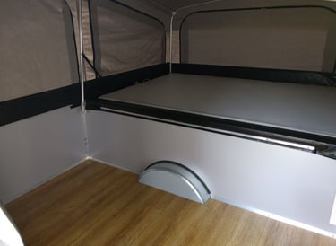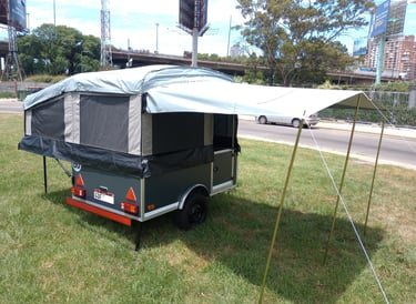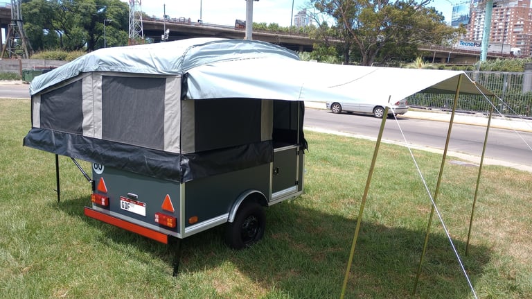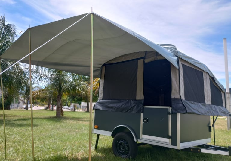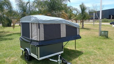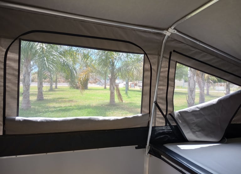 Carpa confeccionada con lona impermeable importada (con proteccion UV. No condensa), costuras selladas, sobre techo incorporado. Cierre lateral para adosar un toldo. Seis ventanas con mosquitero y tapa de lona (apertura con cierre).